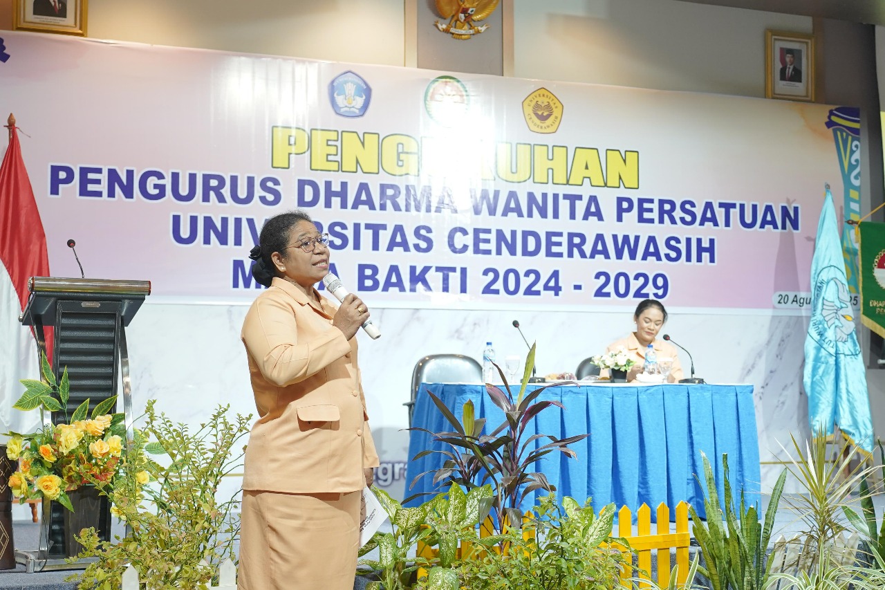 Jayapura, 20 Agustus 2025 — Dharma Wanita Persatuan (DWP) Universitas Cenderawasih (Uncen) resmi dikukuhkan untuk masa bakti 2024–2029 bersama 95 DWP Perguruan Tinggi Negeri (PTN) dan Lembaga Layanan Pendidikan Tinggi (LLDIKTI) se-Indonesia. Prosesi pengukuhan tersebut dilaksanakan secara serentak pada Rabu (20/8) melalui daring dengan pusat kegiatan di Jakarta, berdasarkan Surat Keputusan Nomor 033 Tahun 2025 tertanggal 15 Juli 2025. DWP Uncen sendiri mengikuti prosesi pengukuhan secara daring dari Hotel Grand Abe, Jayapura, dipimpin oleh Ketua DWP Uncen, Ny. Fransina Wambrauw, bersama jajaran pengurus periode 2024–2029. Kehadiran ini menegaskan komitmen DWP Uncen untuk terus berperan aktif dalam mendukung visi-misi universitas, terlebih pasca perubahan status Uncen menjadi Badan Layanan Umum (BLU).