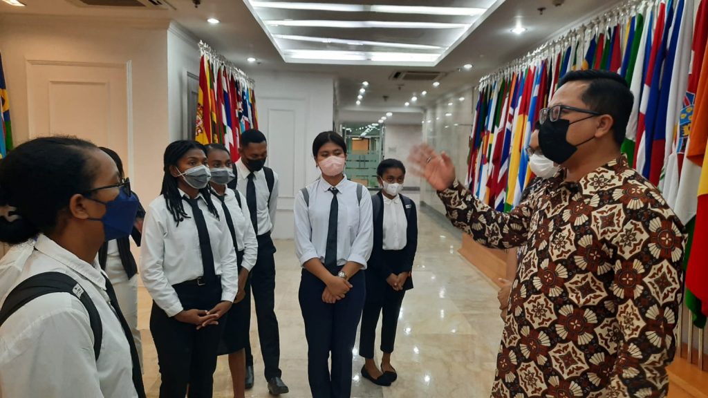 Penyerahan mahasiswa magang program studi Hubungan Internasional FISIP Universitas Cenderawasih & President University, oleh Laus Deo Calvin Rumayom S.Sos.,M.Si dosen HI FISIP UNCEN didampingi Meyland Wambrauw S.IP, M.Si kepada Agung Cahaya Sumirat (Direktur Jenderal Informasi & Diplomasi Publik, Direktur Keamanan Diplomatik), Kementerian Luar Negeri RI, Jakarta, Rabu, 13 Juli 2022.