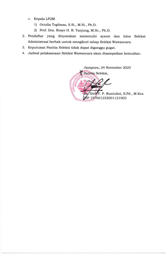 Panitia Seleksi Direktur Program Pascasarjana dan Kepala Lembaga di lingkungan Universitas Cenderawasih, yang diangkat dengan Surat Keputusan Rektor Nomor 604/UN2O/KP/2025 tentang Pengangkatan Panitia Seleksi Direktur Program Pascasarjana dan Kepala Lembaga di Lingkungan Universitas Cenderawasih telah melakukan Seleksi Administrasi dalam rangka Pemilihan Direktur Program Pascasarjana, Kepala Lembaga Penelitian dan Pengabdian Kepala Masyarakat, dan Kepala Lembaga Penjaminan Mutu dan Pengembangan Pembelajaran untuk periode masa jabatan 2025-2029.