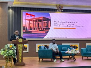 Prof. Narendra Jatna dalam paparannya menekankan bahwa tata kelola yang baik merupakan mesin utama pertumbuhan ekonomi yang berkelanjutan. Beliau menjelaskan bahwa tanpa adanya kepastian hukum, investasi akan menurun dan biaya ekonomi meningkat secara signifikan. “Hukum yang kuat menghasilkan tata kelola yang baik, dan tata kelola yang baik menghasilkan pertumbuhan ekonomi,” tegasnya.