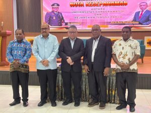 Kegiatan ini turut dihadiri oleh Dekan Fakultas Hukum Dr. Yustus Pondayar, S.H., M.H., Dekan FEB Dr. Otniel Safkaur, SE.Ak., M.Si., beserta jajaran wakil dekan, sub koordinator kerja sama, serta mahasiswa dari lingkungan Universitas Cenderawasih.