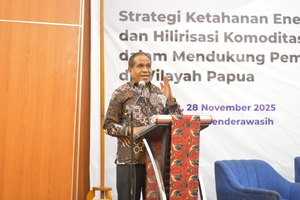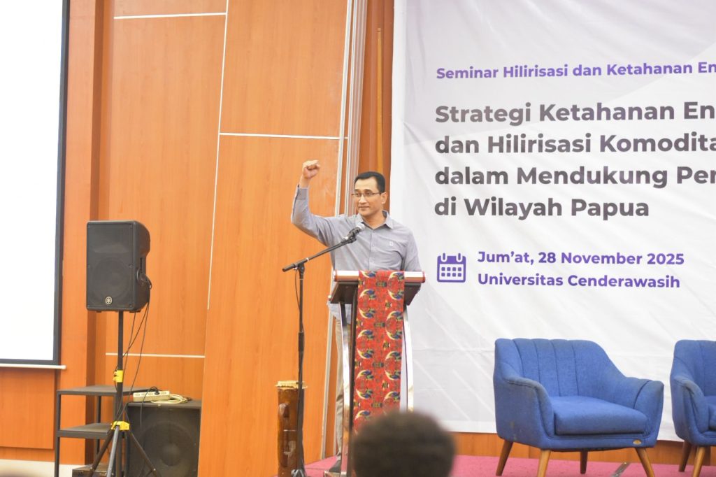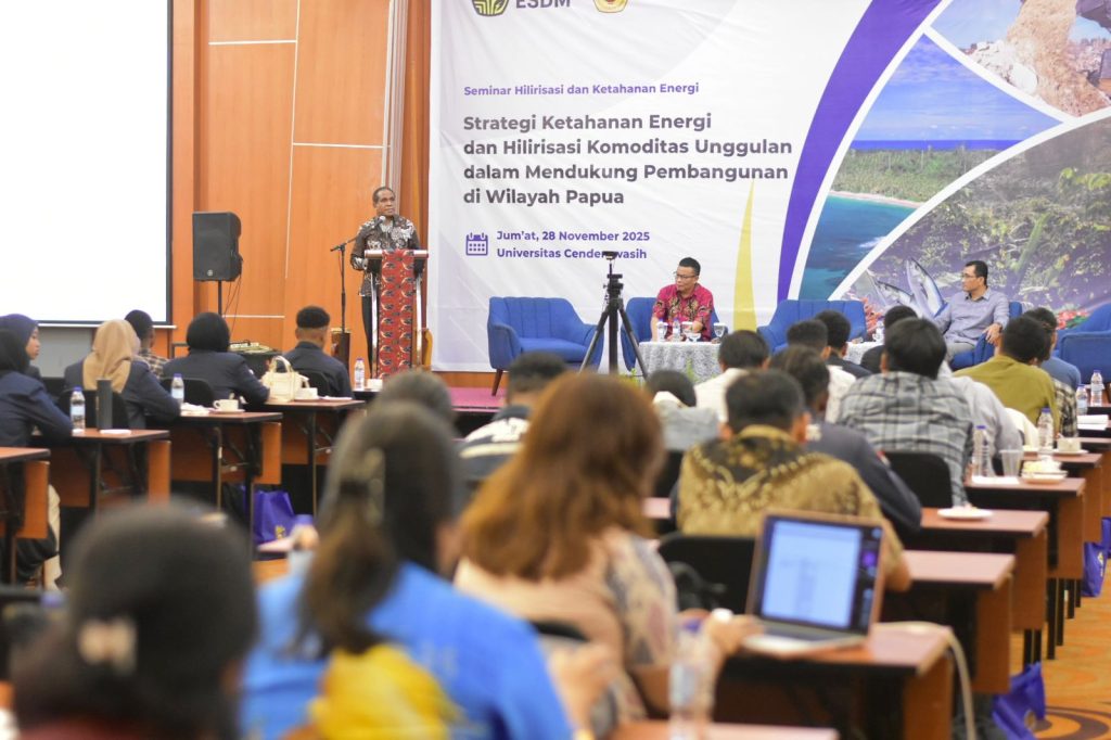 JAYAPURA – Universitas Cenderawasih bersama Kementerian Energi dan Sumber Daya Mineral (ESDM) menyelenggarakan seminar bertema “Strategi Ketahanan Energi dan Hilirisasi Komoditas Unggulan dalam Mendukung Pembangunan di Wilayah Papua.” Universitas Cenderawasih berkolaborasi dengan Kementerian ESDM menggelar seminar di Ballroom Horison Kotaraja, Jumat, 28 November 2025. Kegiatan dihadiri unsur pimpinan universitas, narasumber ahli, serta ratusan mahasiswa dari Uncen, Universitas Ottow Geissler, dan Yapis Papua.
