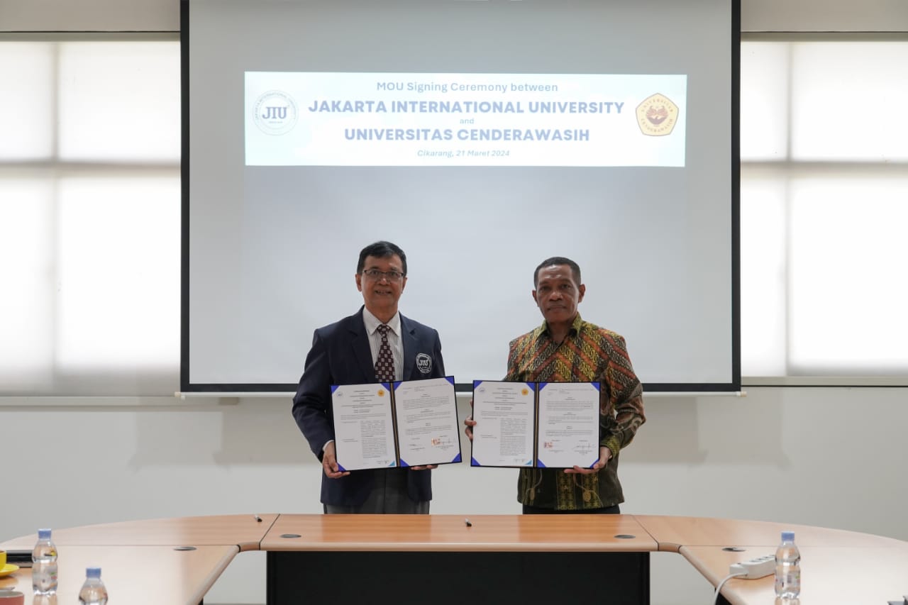 Penandatangan Naskah Memorandum of Understanding (M0U) antara Jakarta Internasional University (JIU) dengan...