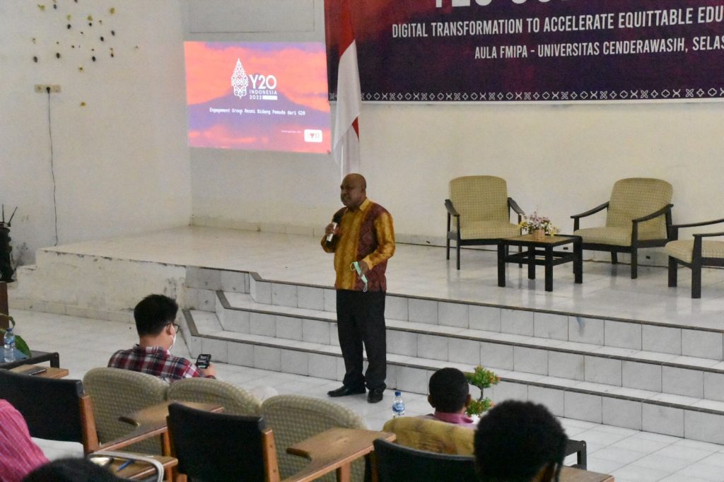 Kegiatan Sosialisasi Youth 20 (Y20) serta sharing untuk mengajak Pemuda Papua berpikir global terkait perubahan yang terjadi, menyuarakan ide dan pemikiran pemuda mengenai ekonomi global,isu-isu sosial, serta peran aktif pemuda dalam pendidikan ataupun perdamaian Engagement Group Bidang Pemuda dari negara G20 menggelar kegiatan turun ke kampus di dengan bertempat di Aula FMIPA Uncen pada Selasa (21/6/2022) dan didukung resmi oleh pemerintah Indonesia sebagai wakil pemuda G20 yang.